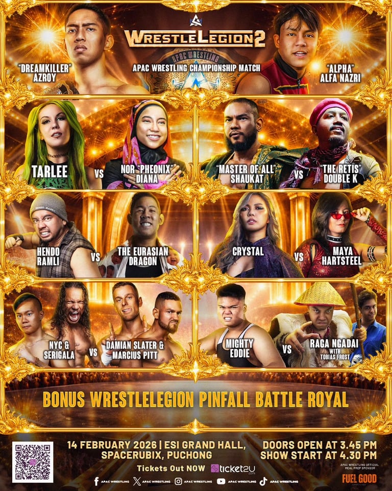 Meta Description: APAC Wrestling WrestleLegion II storms into ESI Grand Hall on 14 February with a sold-out card featuring Dreamkiller Azroy vs Alfa Nazri for the APAC Championship, Nor “Phoenix” Diana vs Tarlee, Crystal vs Maya Hartsteel, and multiple heated rivalries set to explode