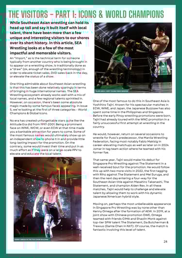 One thing admirable about Southeast Asian wrestling is that this has been done relatively sparingly in terms of bringing in huge international names. The SEA Wrestling ecosystem already works well with a mix of local names and a few regional talents sprinkled in. However, on occasion, there’s been some absolute magic made by some famous faces appearing. In issue 5, we’re looking at the first of three categories - World Champions & Global Icons.