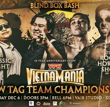 The night will also see the first-ever Blind Box Bash for the VPW Tag Team Championships. Champions The Classic Night defend against The Rocky Horror Show—the duo of “The Founder” Rocky Huynh and The British Horror. With mystery boxes scattered around the arena containing unknown weapons or surprises, anything can—and likely will—happen.
