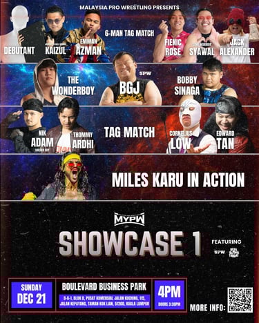 Malaysia Pro Wrestling closes out the year with SHOWCASE 1, held at the MYPW training center for a more intimate experience featuring established stars and rising prospects.