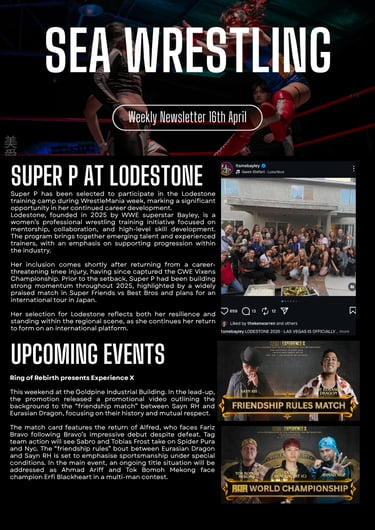 Latest from SEA Wrestling Weekly (April 17): ROR Experience X preview, WUW Fight Night 3’s final Brawlpit show, new Saigon Slam matches, and Super P selected for Bayley’s Lodestone Camp.