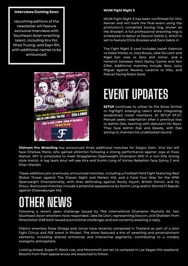 Upcoming editions of the newsletter will feature exclusive interviews with Southeast Asian wrestling talent, including Kru Pol, Khoa Truong, and Sayn RH, with additional names to be announced.