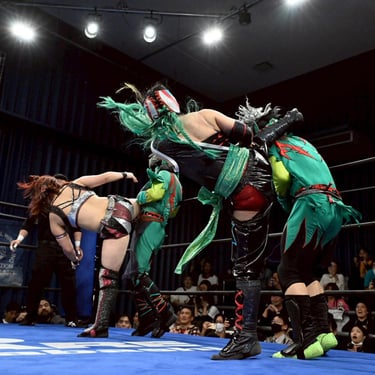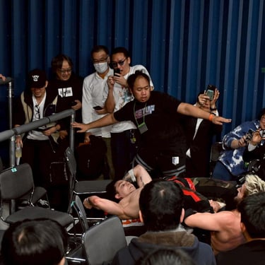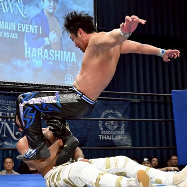 A frog splash nearly finished it, but Shivam answered with a single-leg Boston Crab. Power moves followed from both sides, including a sharp sit-out powerbomb from Shivam and a dead-on kick from HARASHIMA. Forearms from Shivam swung momentum again until the preying mantis hold failed, allowing HARASHIMA to land a running sliding dropkick for the three.