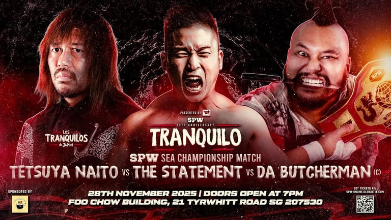 SPW’s Southeast Asian Championship hits a new peak as Da Butcherman defends against The Statement and NJPW icon Tetsuya Naito in a high-stakes Triple Threat showdown at SPW Tranquilo.