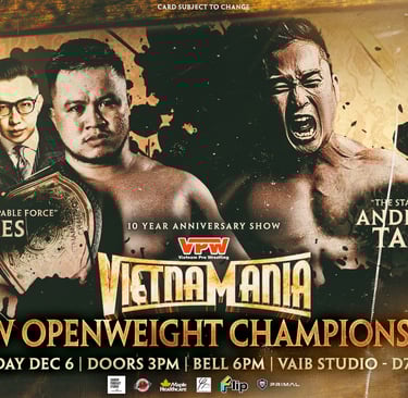 Experience VPW Vietnamania, Vietnam Pro Wrestling’s biggest event of the year, featuring top Southeast Asian talent, major championship bouts, and milestone moments celebrating VPW’s 10th anniversary. Don’t miss the show that’s defining Vietnamese wrestling’s global rise.